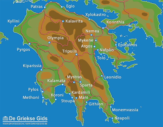 De Peloponessos heeft drie grote wegennetten die naar plaatsen leiden vol natuurschoon, met belangrijke archeologische vondsten: aarde en stenen die getuigen van een ver verleden. Je kunt per trein vanuit Athene naar de Peloponessos. Er is een treinverbinding van Korinthe-Patras-Pirgos-Olympia-Kalamata-Tripoli-Nafplio-Korinthe en veel tussenliggende dorpen.